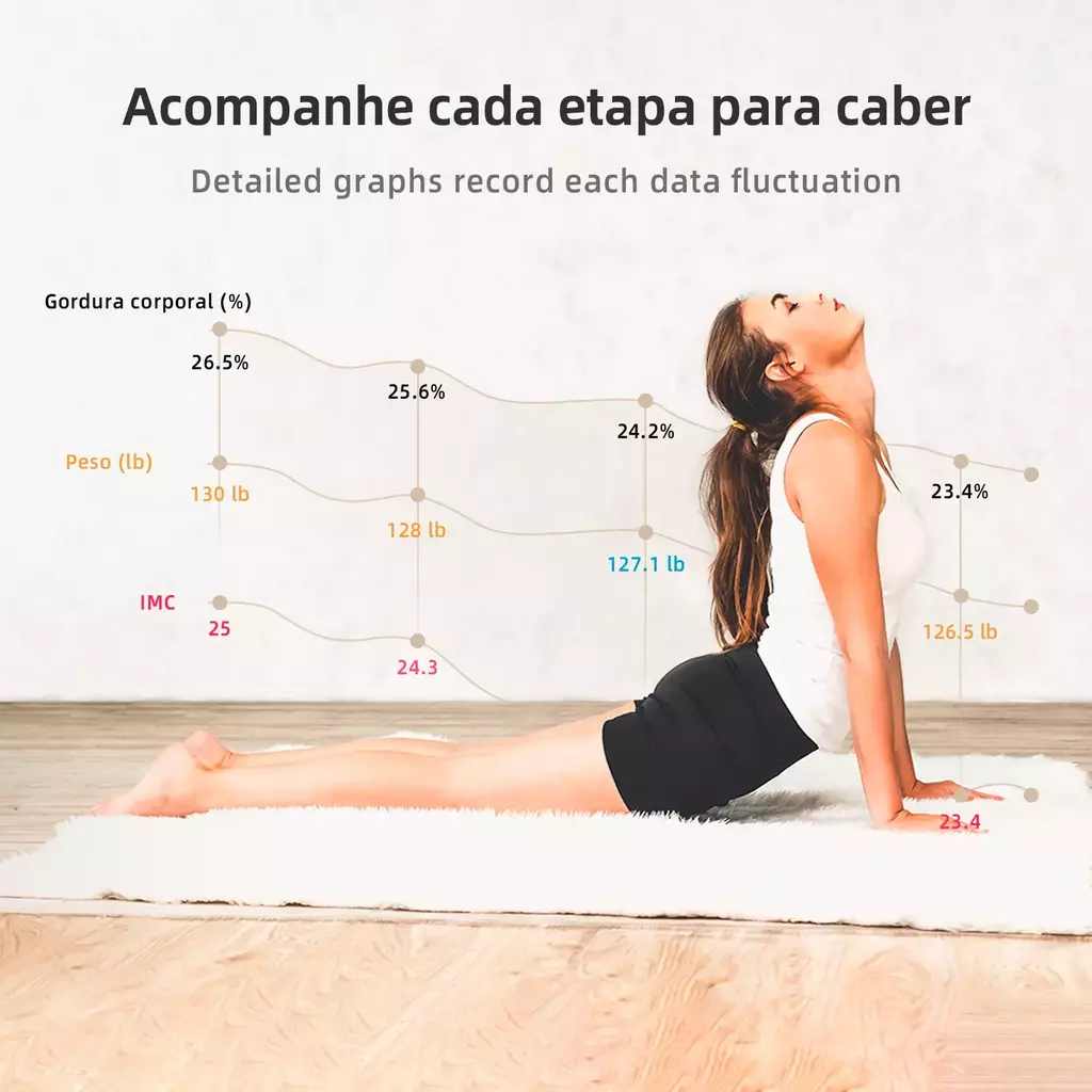 Com a função de determinar o índice de massa corporal (IMC) e a idade corporal, esta balança inteligente é perfeita para monitorar a saúde de todos os membros da família, promovendo um estilo de vida mais saudável.