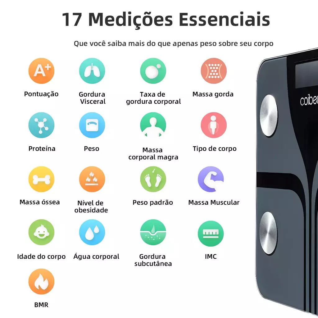 A balança inteligente oferece 17 medições essenciais, incluindo gordura visceral, massa muscular, taxa de gordura corporal, peso ideal e muito mais. Fique no controle do seu bem-estar com resultados detalhados.